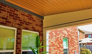 Inside the ceiling, we went with tongue-and-groove paneling, stained in a custom color that pulls in the brick tones really nicely. We also installed a large ceiling fan to help with airflow and keep the space comfortable most of the year.