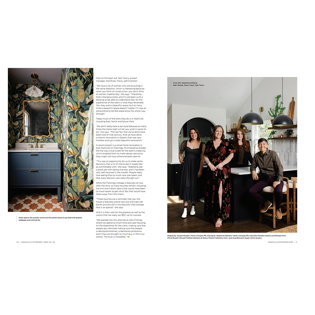 In this special 25th-anniversary edition, Nashville Interiors celebrates the city’s dynamic growth and the creative professionals who contribute to its vibrant design community. Being part of this milestone issue is an incredible honor for us. Our feature highlights our Flamingo renovation, a down-to-the-studs renovation in theheart of East Nashville with a keen eye toward design and elevated selections. This acknowledgment not only showcases our passion for working alongside talented design professionals but also underscores our role in shaping the aesthetic landscape of Middle Tennessee.