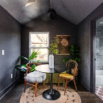 The large peninsula not only serves as a prep space but also doubles as a breakfast bar, perfect for casual meals or a glass of wine with friends. We added ample storage with custom cabinetry, maximizing every inch of space. And for those who love to cook (or simply need a little extra storage), the dark and bold dining area with an attached full bath tucked away behind the kitchen is a game-changer. It was meant to impress your friends and to be the setting (and photo backdrop) behind every friend get-together.
