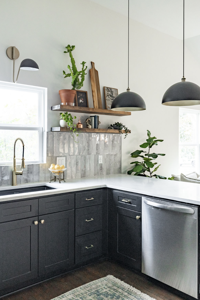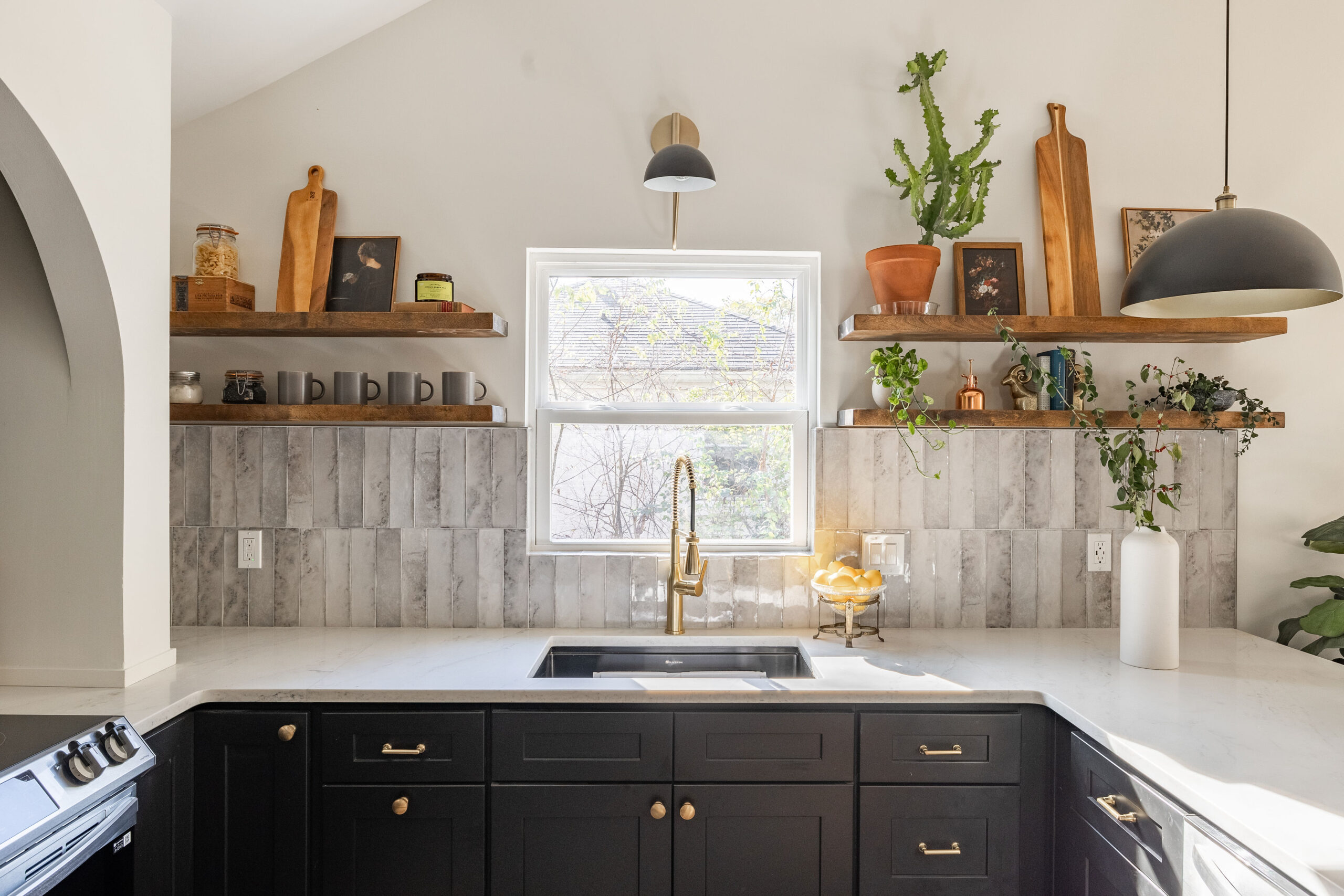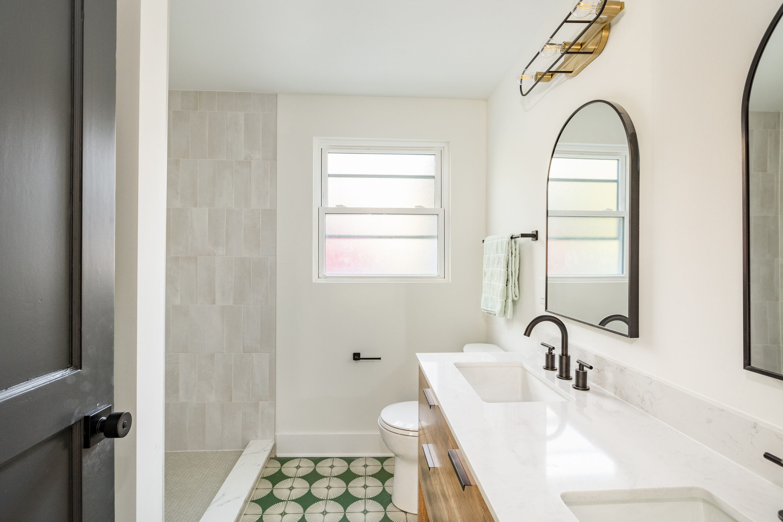 We wanted to create a space that felt both modern, and captured the heart of the neighborhood in which it sits, with elements that complemented the overall vibe of the house. The color palette is a perfect blend of soft, muted tones with bold accents. We chose crisp white cabinetry as a base, offering a clean, airy look. But the real showstopper? The deep, rich arches, black cabinetry, and green tile that anchors the space and brings in a touch of modern sophistication. Paired with brass hardware, the combination feels colorful but never too overwhelming.