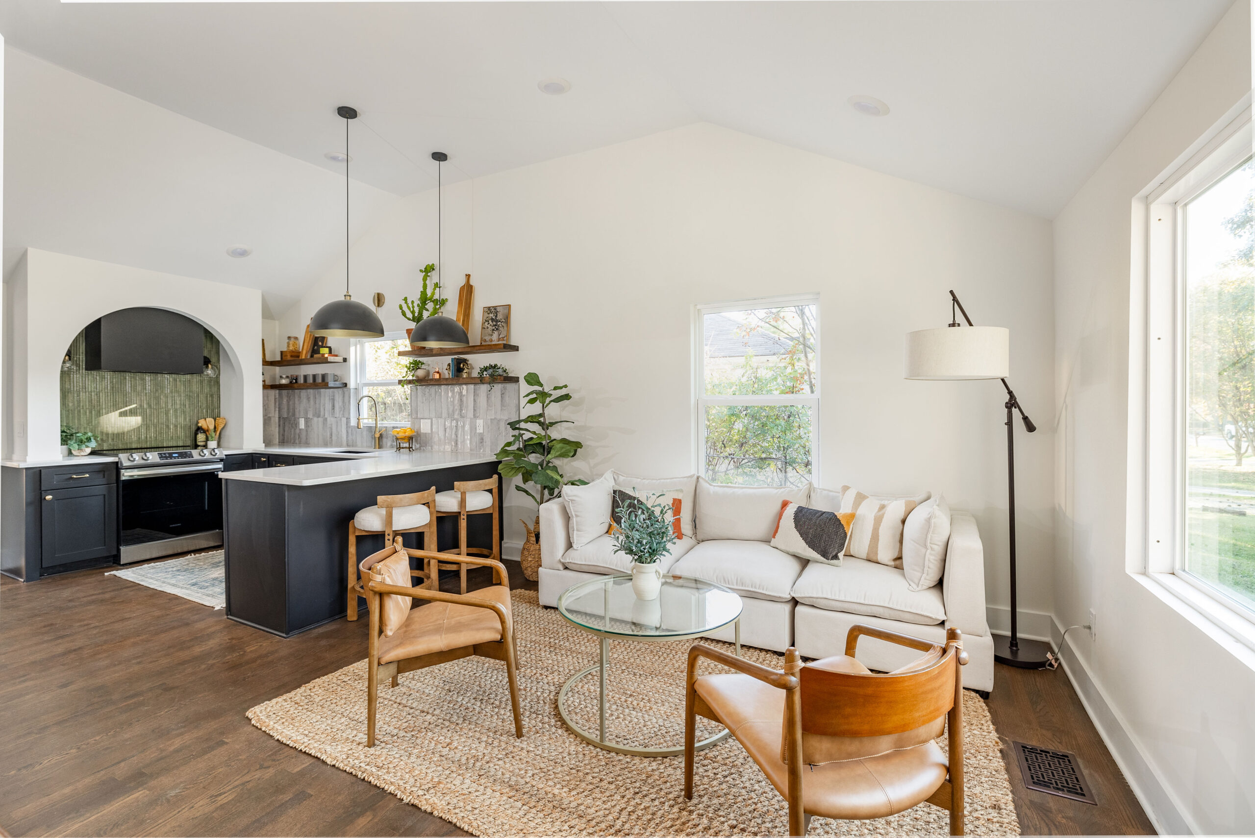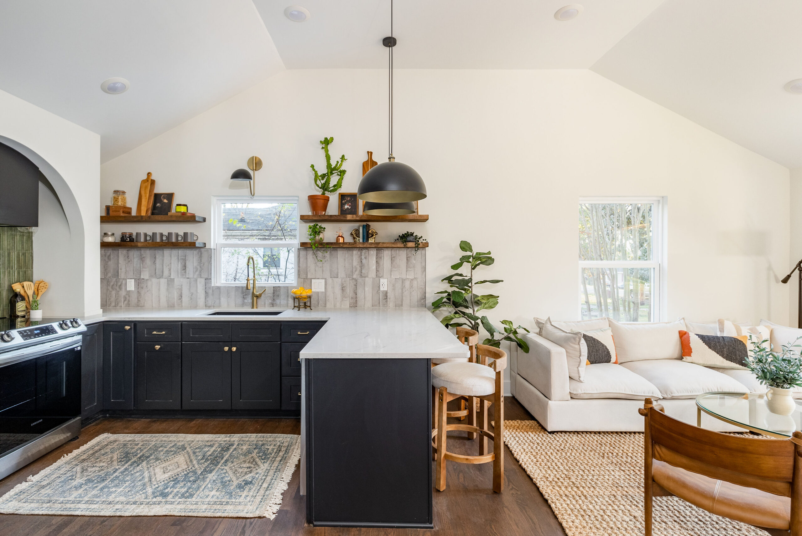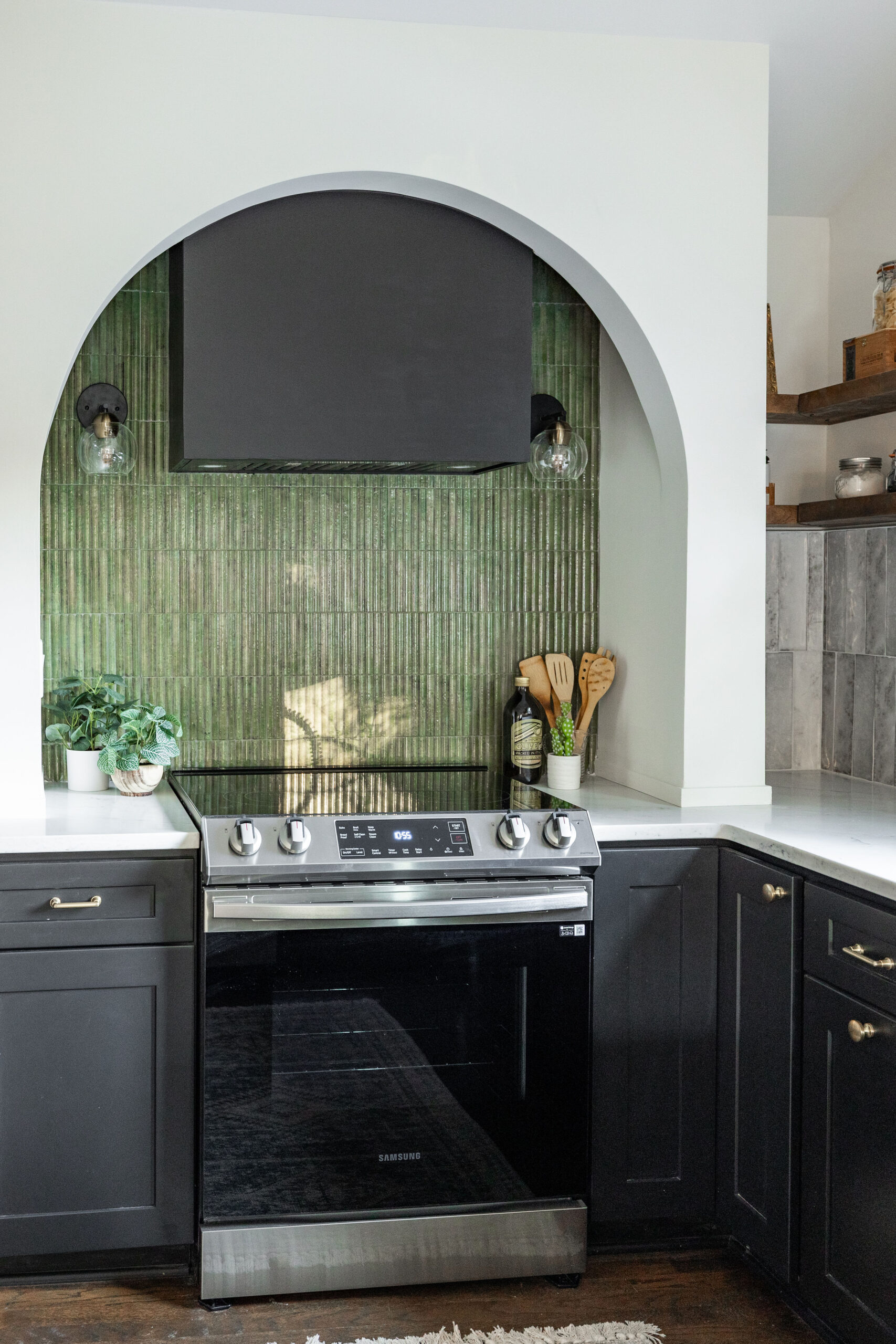 We wanted to create a space that felt both modern, and captured the heart of the neighborhood in which it sits, with elements that complemented the overall vibe of the house. The color palette is a perfect blend of soft, muted tones with bold accents. We chose crisp white cabinetry as a base, offering a clean, airy look. But the real showstopper? The deep, rich arches, black cabinetry, and green tile that anchors the space and brings in a touch of modern sophistication. Paired with brass hardware, the combination feels colorful but never too overwhelming.