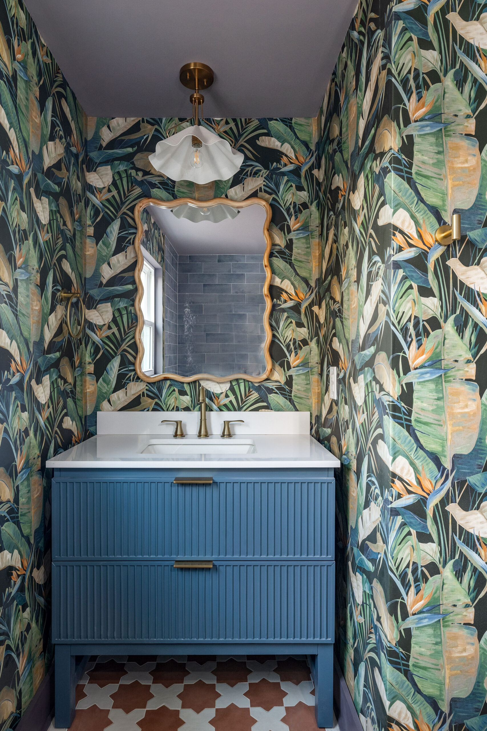 The countertops are a dream come true. We selected a stunning quartz with subtle veining to add texture and visual interest, while keeping the overall vibe light and breezy. And the backsplash—oh, the backsplash! A rippled deep green hue that catches the vibe just right. It’s a soft nod to the Flamingo House’s playful name, without being too literal.
