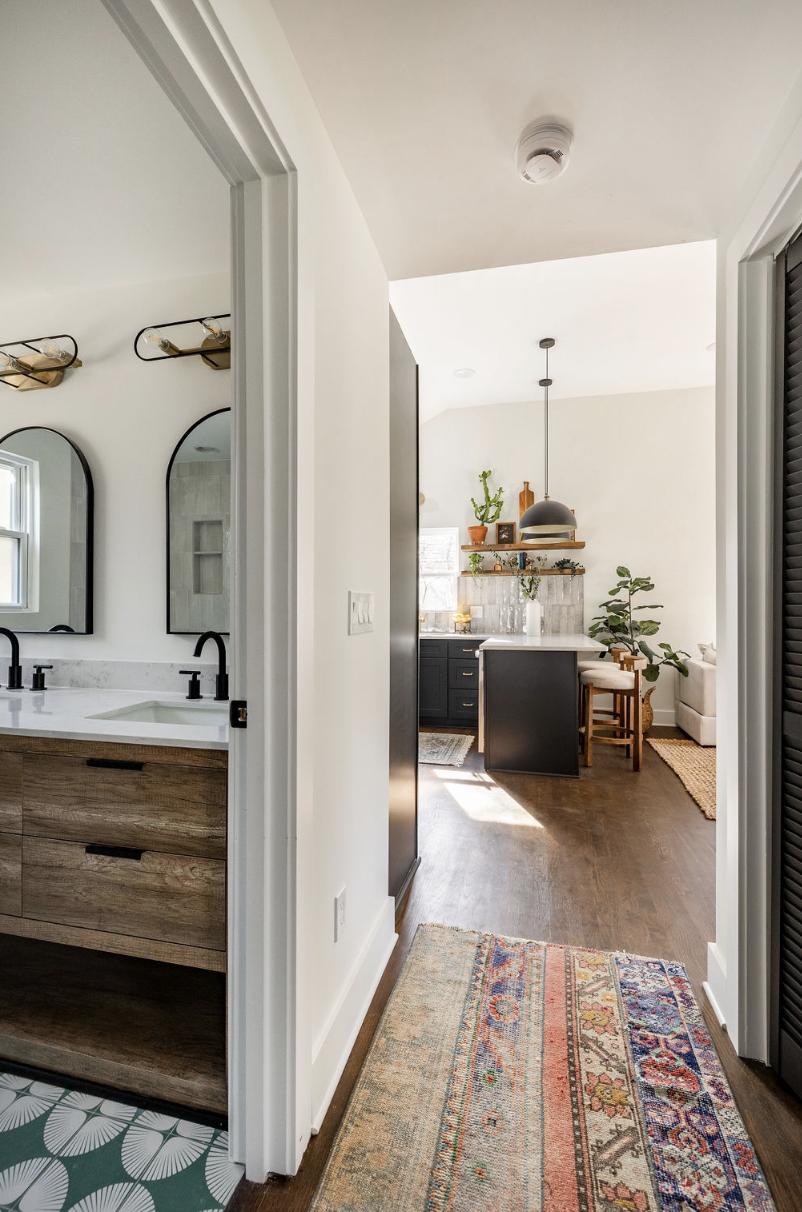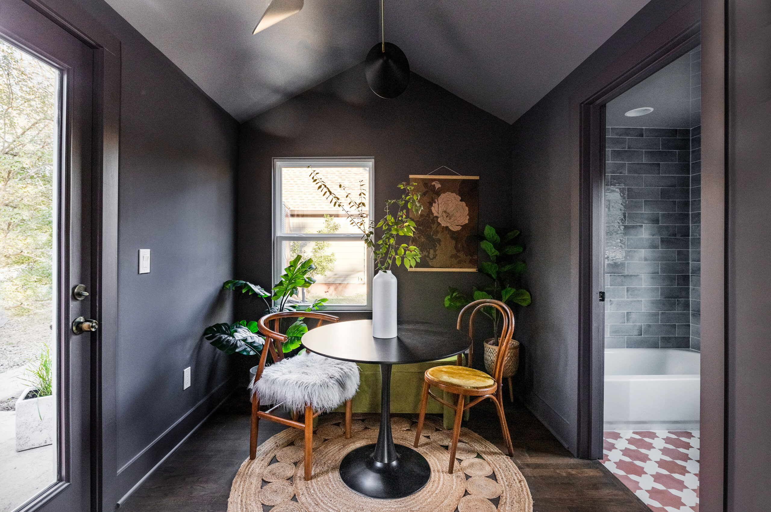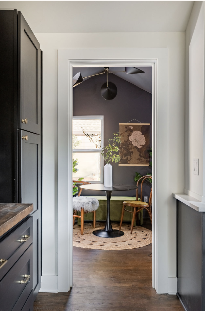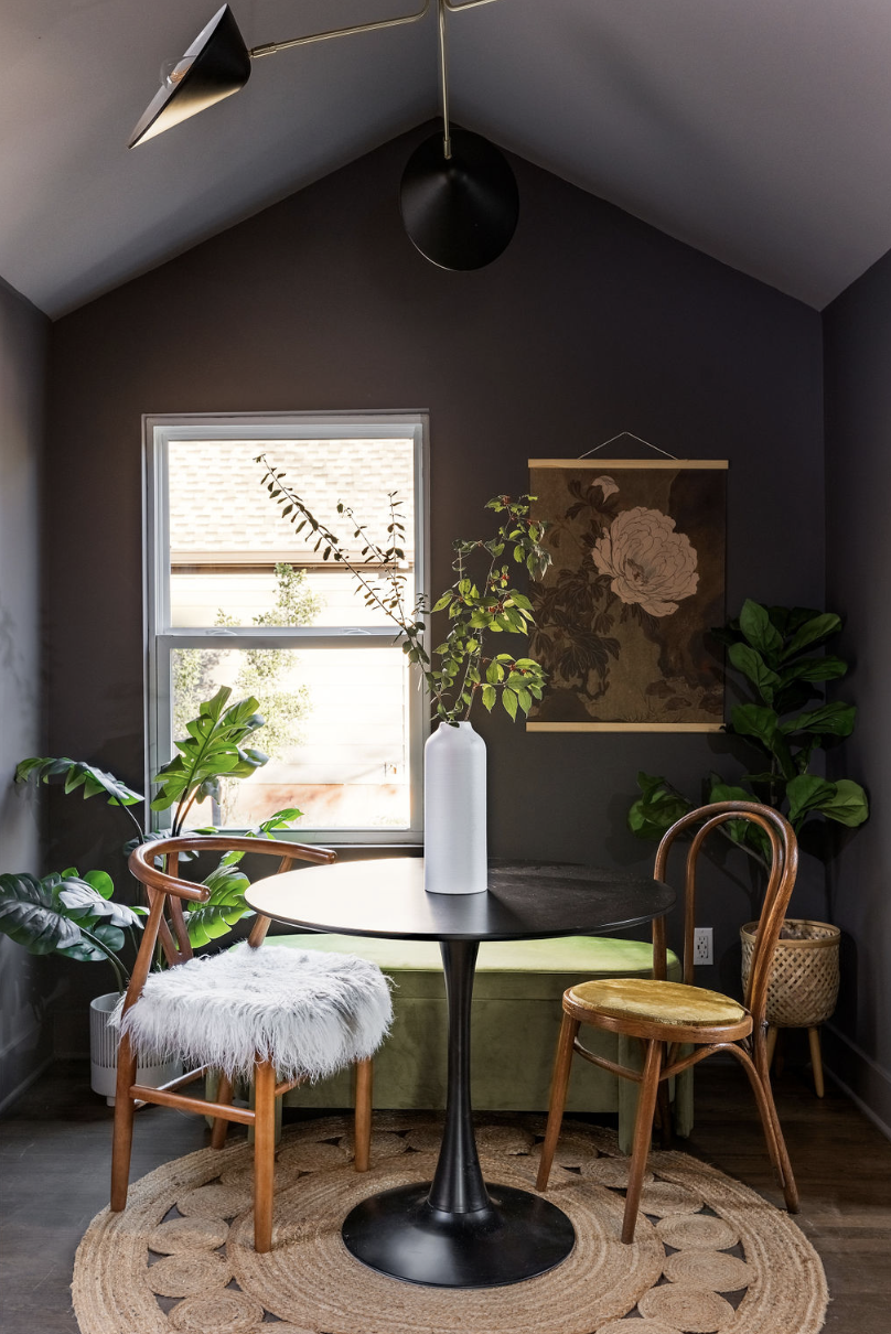 The large peninsula not only serves as a prep space but also doubles as a breakfast bar, perfect for casual meals or a glass of wine with friends. We added ample storage with custom cabinetry, maximizing every inch of space. And for those who love to cook (or simply need a little extra storage), the dark and bold dining area with an attached full bath tucked away behind the kitchen is a game-changer. It was meant to impress your friends and to be the setting (and photo backdrop) behind every friend get-together.